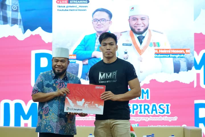 Bengkulu, Pusaranupdate.com -Gubernur Bengkulu Helmi Hasan memberikan penghargaan kepada atlet MMA One Pride asal Bengkulu, Deni Arif Fadhillah, atas prestasinya mengharumkan Bumi Merah Putih di kancah nasional.