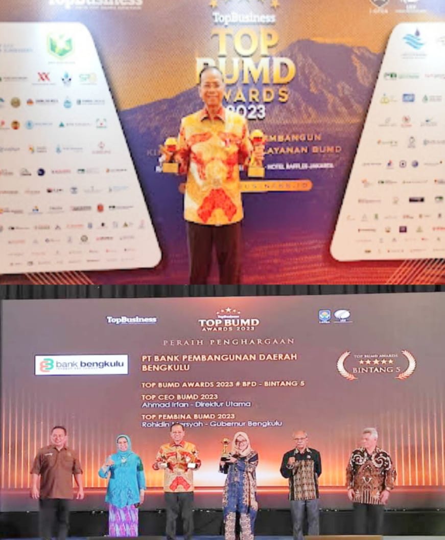 Pada acara penghargaan bergengsi untuk perusahaan BUMD ini PT Bank Pembangunan Daerah Bengkulu (BPD Bengkulu) meraih sejumlah kategori penghargaan, di antaranya TOP BUMD Awards 2023 BPD – Bintang 5, TOP CEO BUMD 2023 yang ditujukan bagi Ahmad Irfan selaku Direktur Utama, dan TOP Pembina BUMD 2023 untuk Rohidin Mersyah sebagai Gubernur Bengkulu.