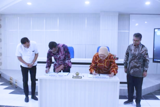 Penandatanganan MoU dilakukan oleh Pj Bupati Bengkulu Tengah Dr. Heryandi Roni, M.Si dengan Rektor Universitas Bengkulu Dr. Retno Agustina Ekaputri, S.E., M.Sc.