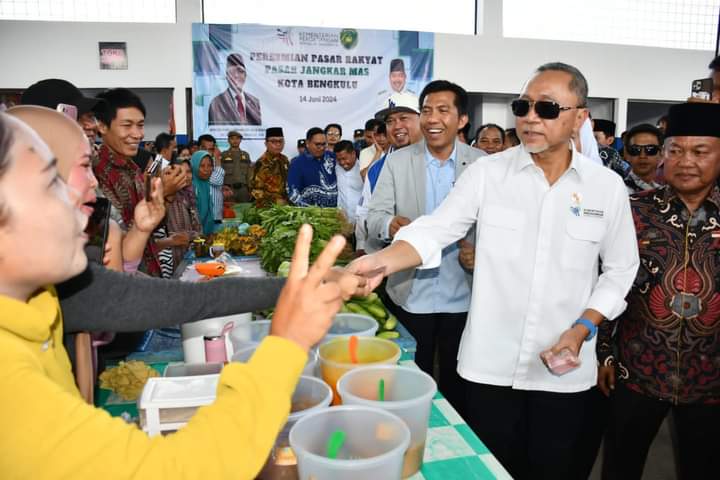 Didampingi pejabat jajaran Kementerian Perdagangan dan Pj Walikota Bengkulu Arif Gunadi, Zulhas menanyakan harga-harga kebutuhan pokok yang dijual di pasar tersebut dan memborong beberapa barang dagangan pedagang.