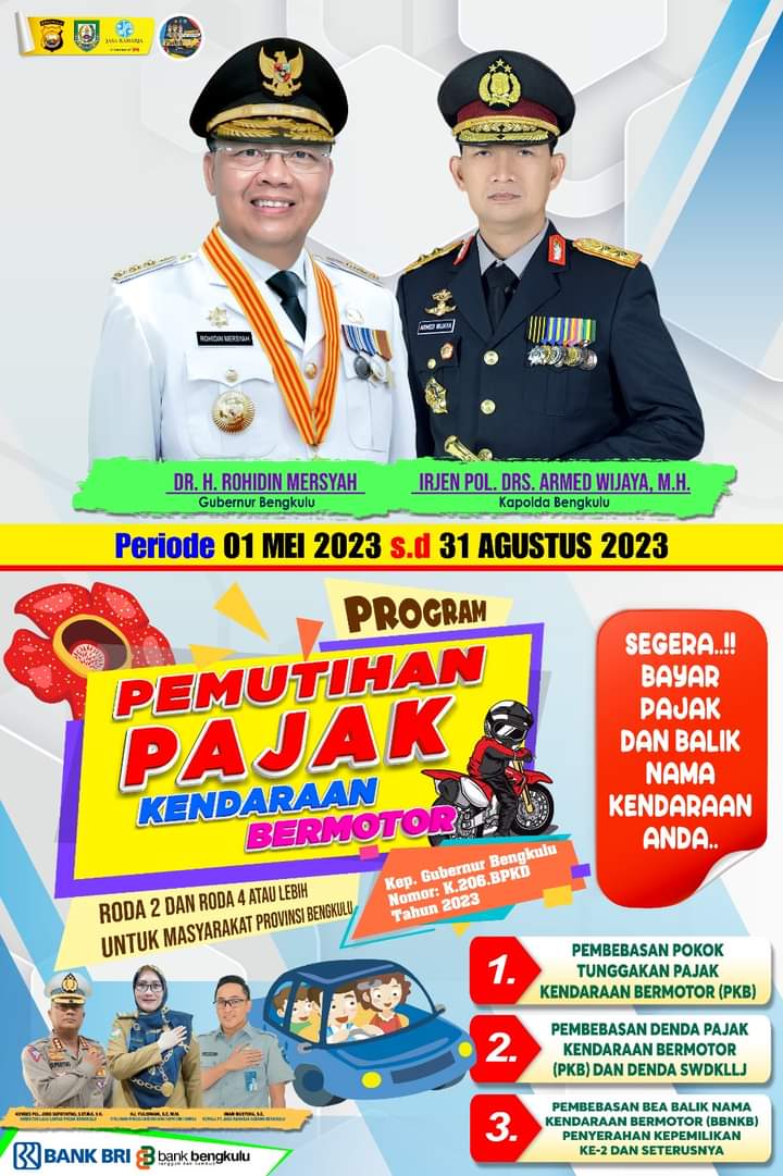 Ket Foto: Program Gubernur Bengkulu dan Wagub, Pemutihan Pajak Kendaraan Roda Dua Tahun 2023 Kembali Diberlakukan terhitung mulai 1 Mei-31 Agustus 2023.
