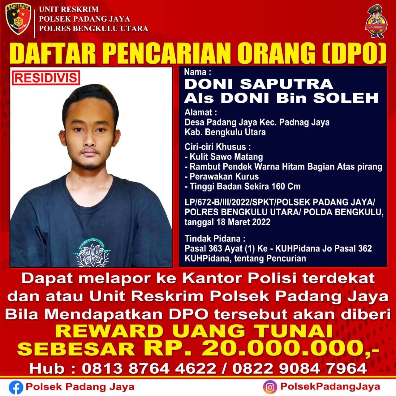 Bengkulu Utara, Pusatanupdate.com – Kepolisian Sektor Padang Jaya kembali mengumumkan Daftar Pencarian Orang (DPO) atas nama Doni Saputra (22). Tersangka yang merupakan warga Desa Marga Sakri, Kecamatan Padang Jaya tersebut kabur dari tahanan dengan cara mencongkel jeruji besi tahanan beberapa minggu lalu.