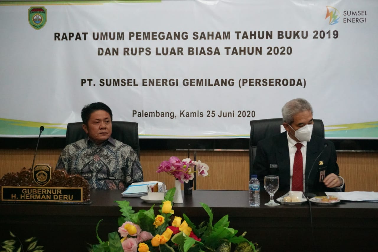 Palembang, Pusaranupdate.com– Gubernur Sumsel H Herman Deru menghadiri Rapat Umum Pemegang Saham (RUPS) tahun buku 2019 dan RUPS Luar Biasa tahun 2020 PT. Sumsel Energi Gemilang (Perseroda) di Hotel Swarna Dwipa Palembang, Kamis (25/6/2020).