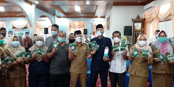 Pembagian masker, face shield dan partisi dilakukan secara simbolis oleh Wakil Walikota Bengkulu Dedy Wahyudi didampingi Staf ahli bidang Pemerintahan Kota Bengkulu Matriyani Amran, Kadi Perindag Dewi Dharma dan Kadinkes Susilawaty.